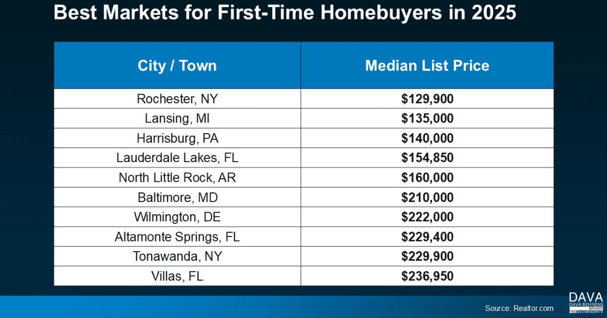 According to a report from Realtor.com, these are some of the best markets for first-time homebuyers this year (see chart below):