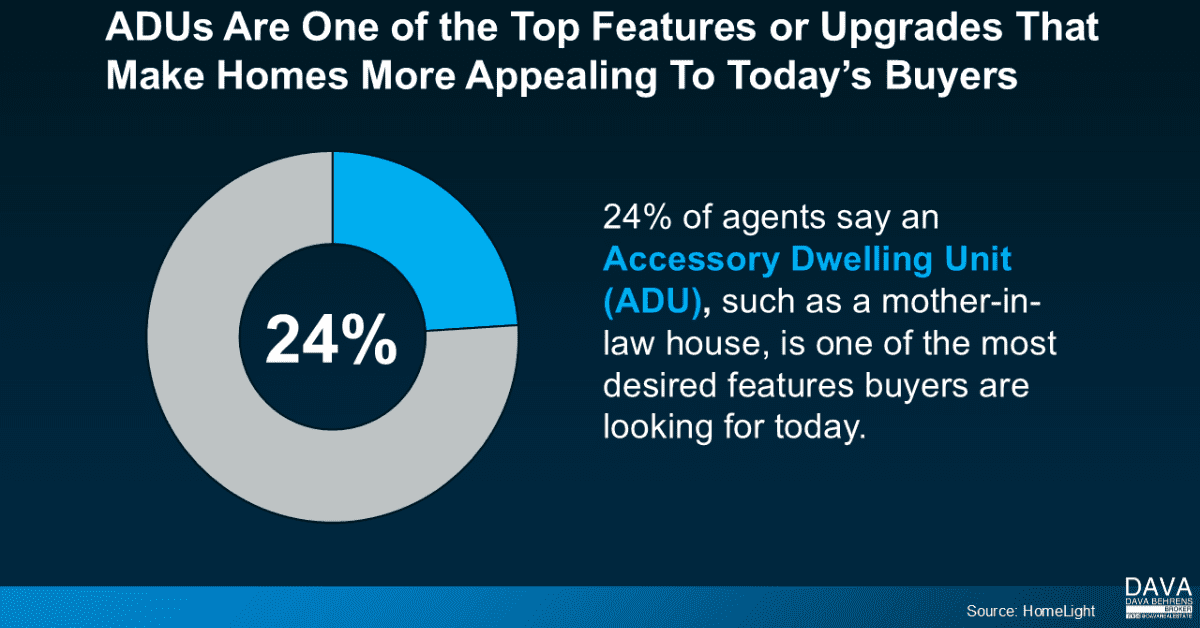 ADUs are growing in popularity as more people discover why they’re so practical. In fact, a recent survey shows that 24% of agents say an ADU, such as a mother-in-law house, is one of the most desired features buyers are looking for right now.