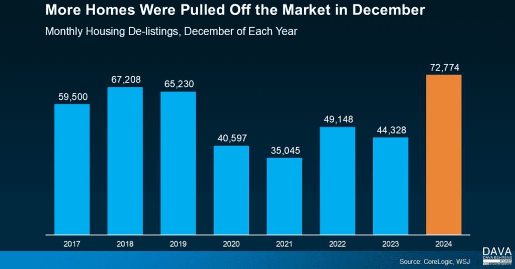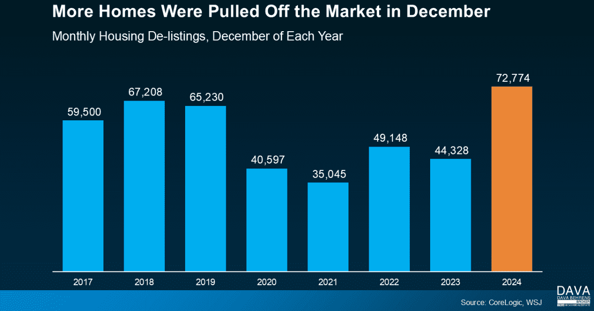 If you took your house off the market in late 2024, you’re not the only one. Newsweek reports that data from CoreLogic and the Wall Street Journal (WSJ) says nearly 73,000 homes were pulled from the market in December alone – that’s more than any other December going all the way back to 2017 (see graph below):